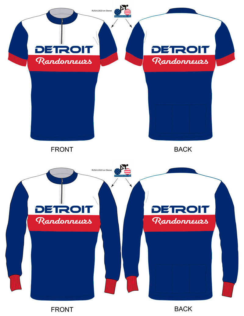 We have a custom designed Detroit Randonneurs 100% merino wool jersey in the classic style, manufactured by Woolistic.